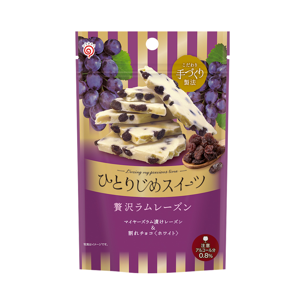 ホワイトチョコレートにラムレーズンをたっぷり混ぜ込みました。レーズンとホワイトチョコの味、食感、香りのバランスをお楽しみください。